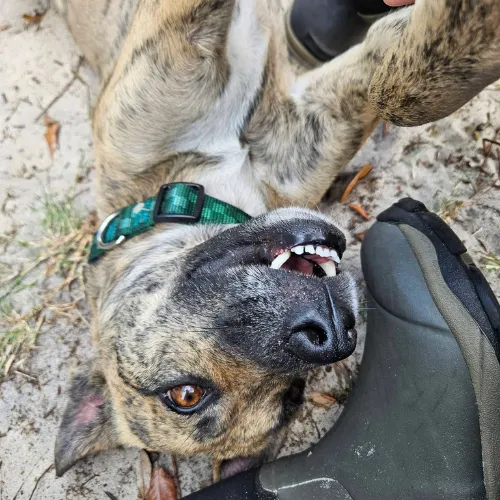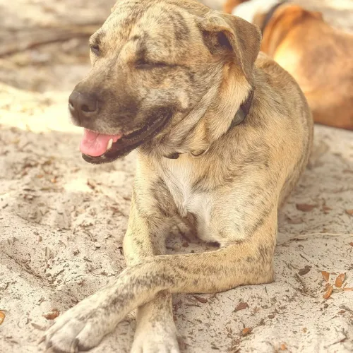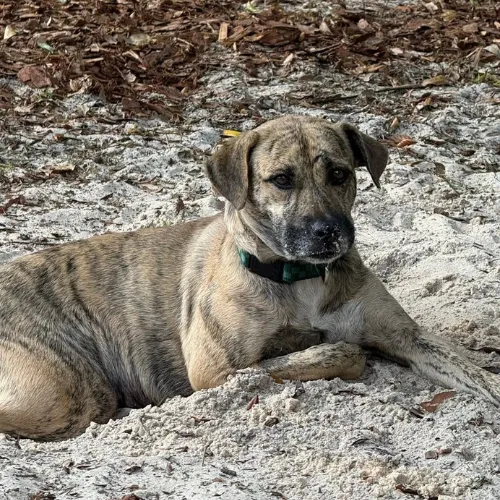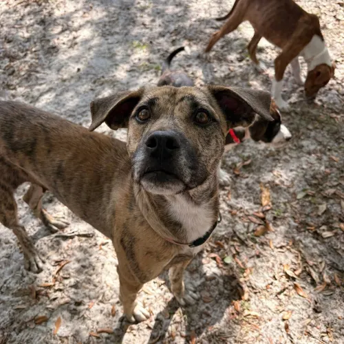 Beautiful tan brindle with black streaks and white markings
